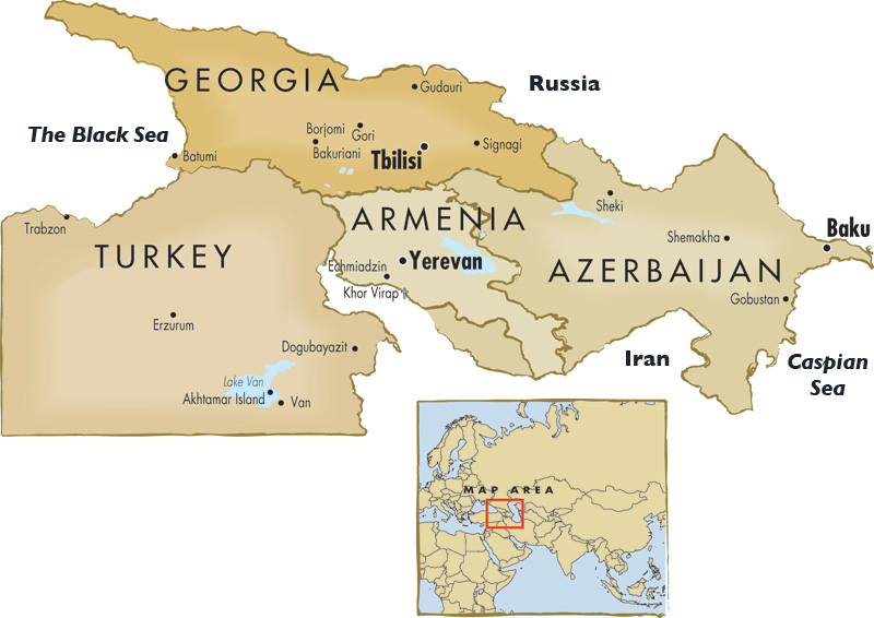 The little country of Georgia, where Jason once sought the Golden Fleece, is set along the eastern Black Sea shore just above Turkey. Its lush lowlands extend upwards into the dizzying heights of the Caucasus Mountains. With its South Caucasus companions Armenia and Azerbaijan, it fills the rugged spaces between the Black and the Caspian Seas.