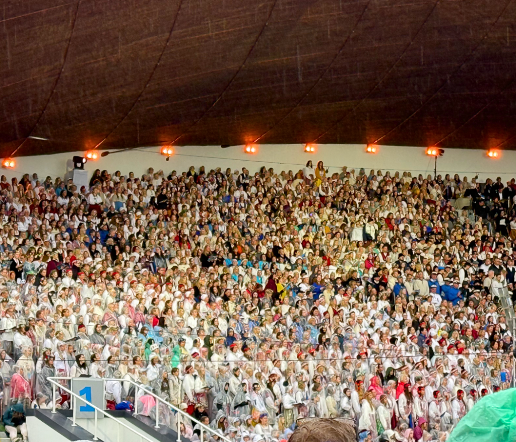 Estonia’s Song Festival, or Laulupidu, is one of the world’s largest and most moving choral gatherings – a massive, open-air celebration of music, freedom, and national pride that takes place just once every five years. If you want to understand the heart of Estonia, this is where to start. Tens of thousands of singers, even more spectators, and a sea of folk costumes and bright flags, rain or shine. I had always wanted to attend this legendary event and decided it would be the perfect way to spend a birthday. The chance to take in both the opening concert and the grand main performance made the experience even more memorable. Each has its atmosphere: the opening night is more formal, like an overture with speeches and a presentation-style program. The main concert, held two days later, is all about the pure power of song. There are more choirs, more voices, and an unforgettable finale when everyone in the stadium stands and sings together. Take a closer look inside Estonia’s Song Festival!